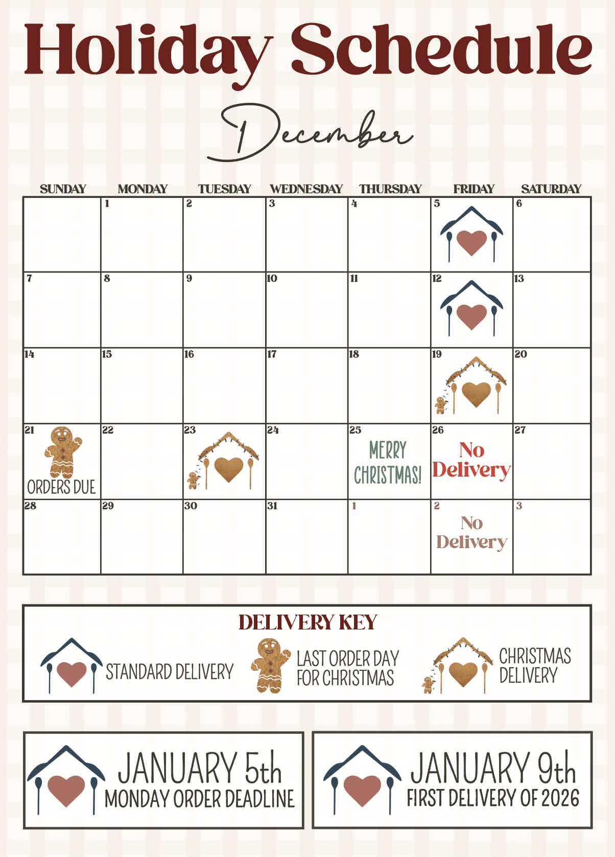 - We have also attached a calendar that outlines any delivery schedule changes around Christmas and the New Year.