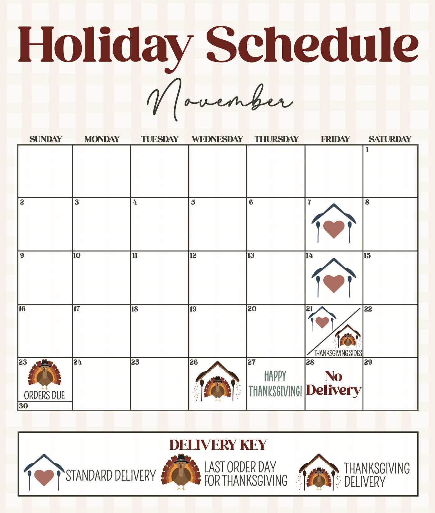 - We have also attached a calendar that outlines any delivery schedule changes around Thanksgiving.