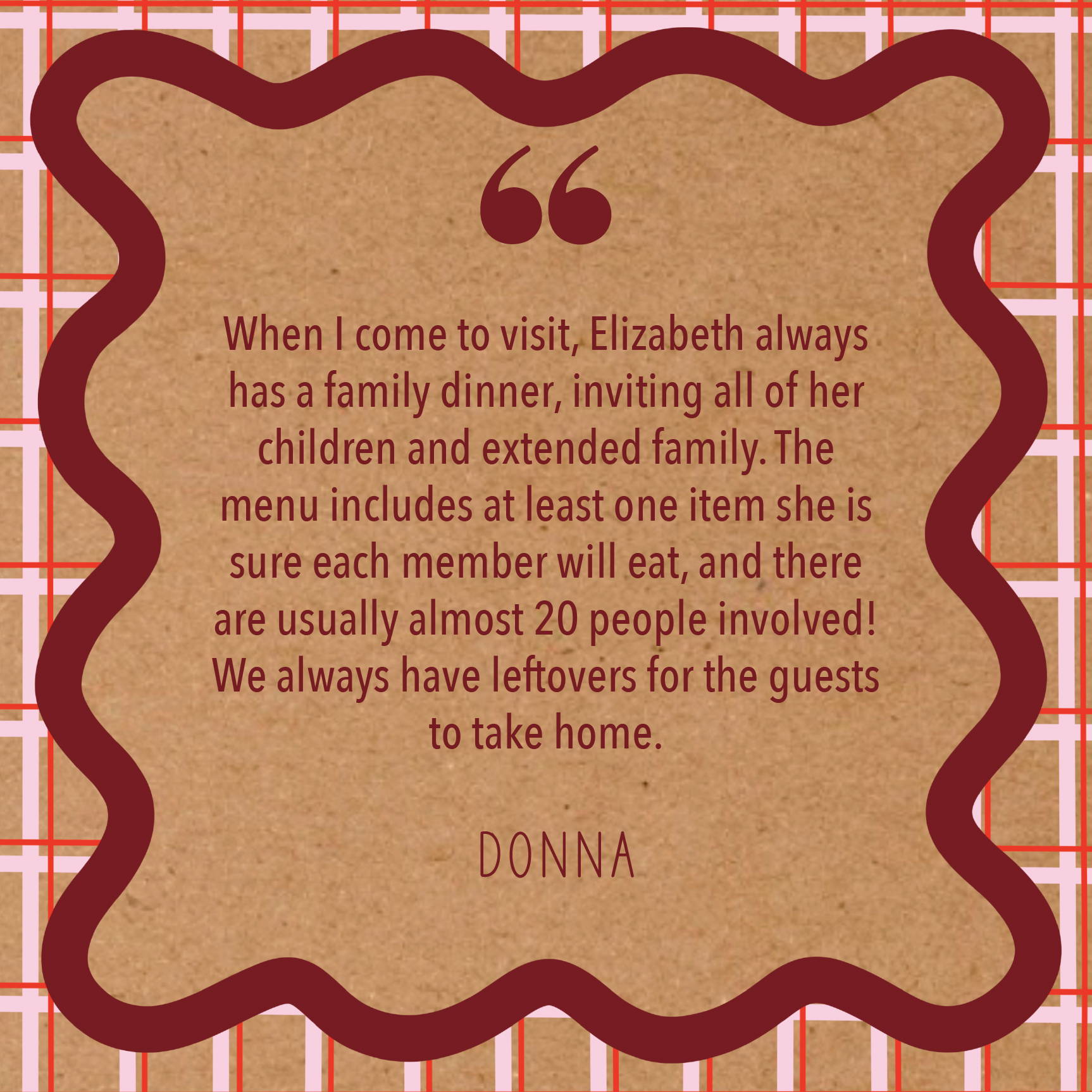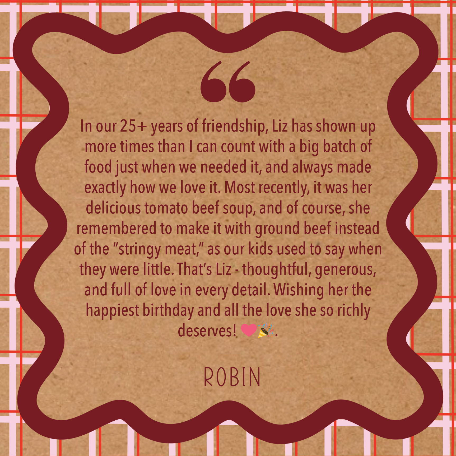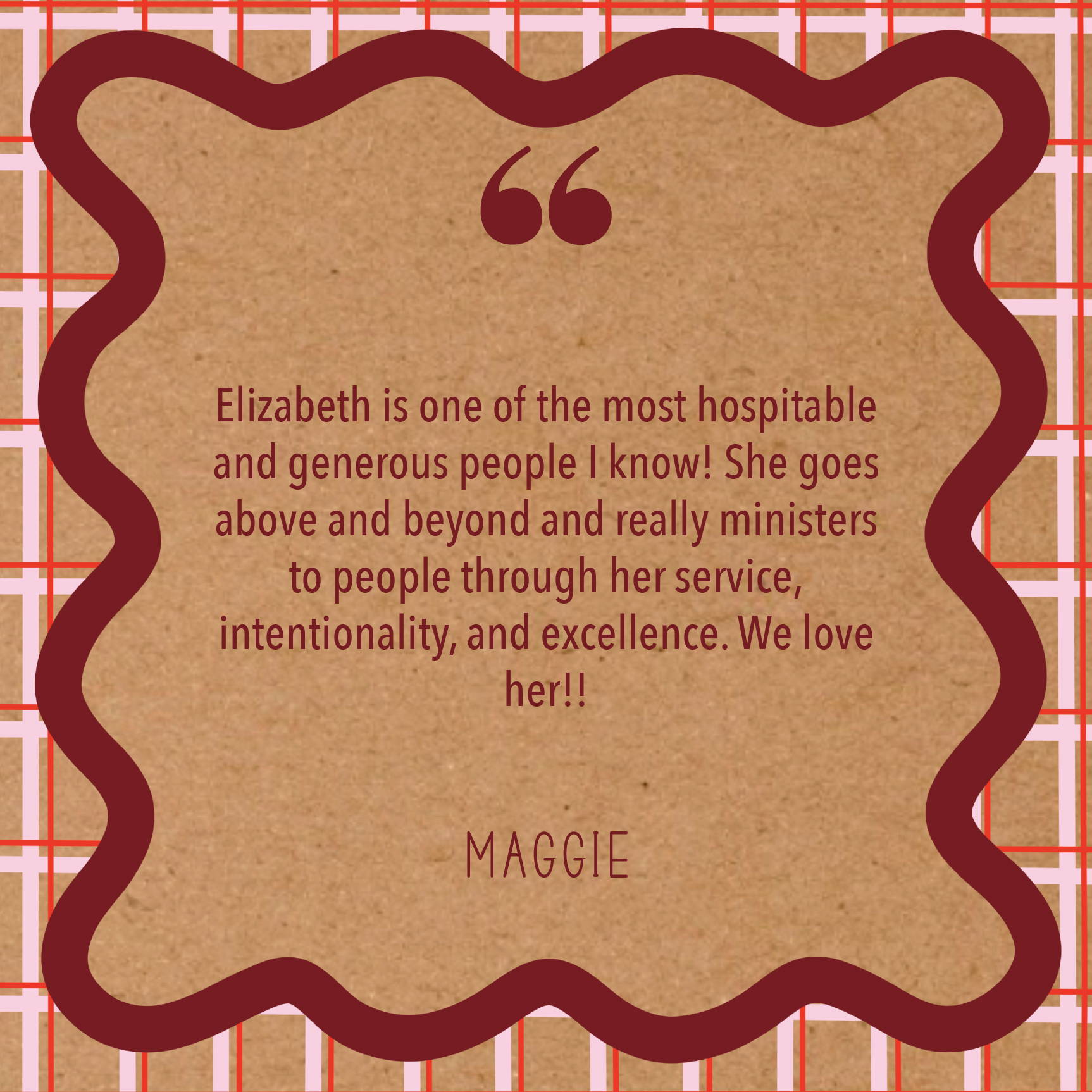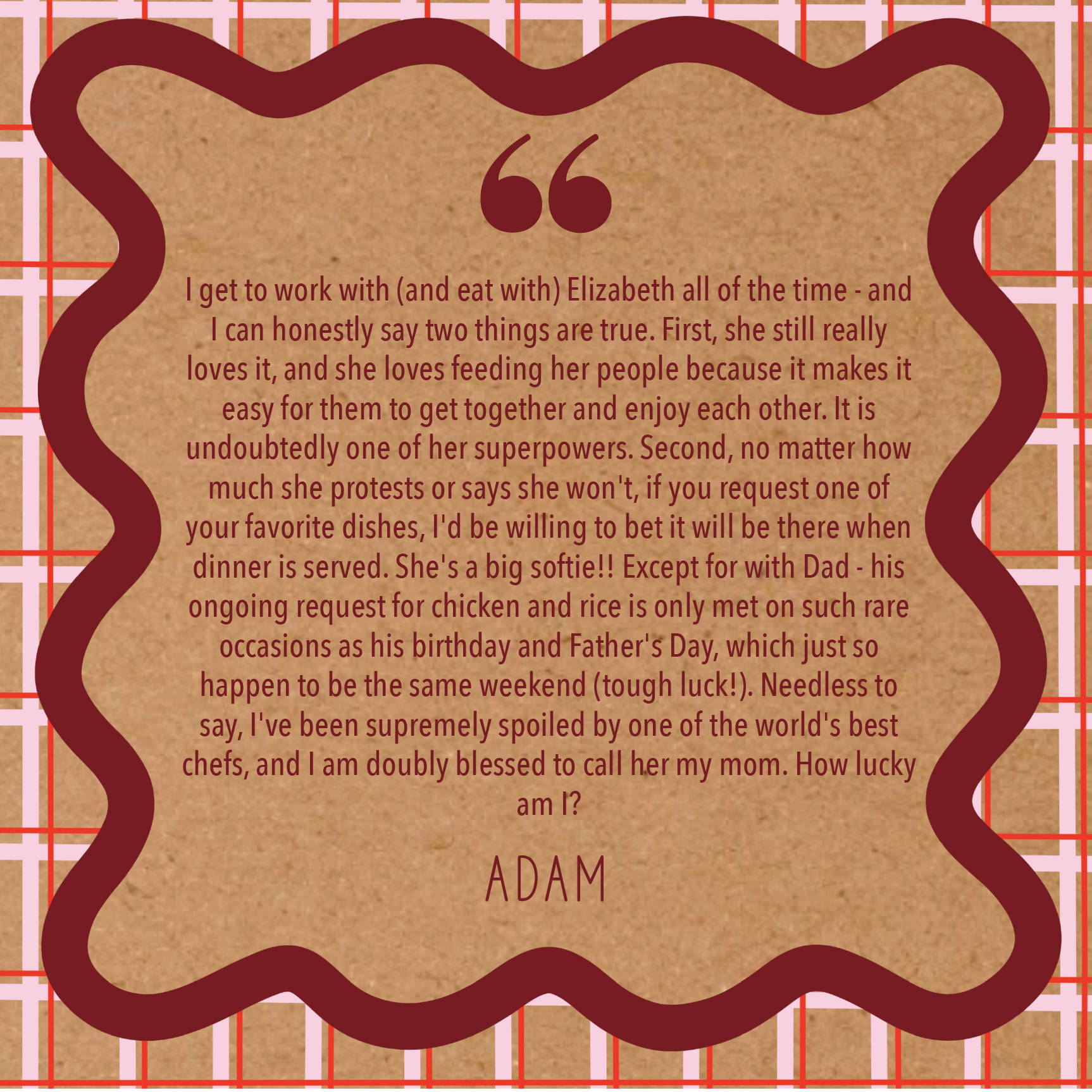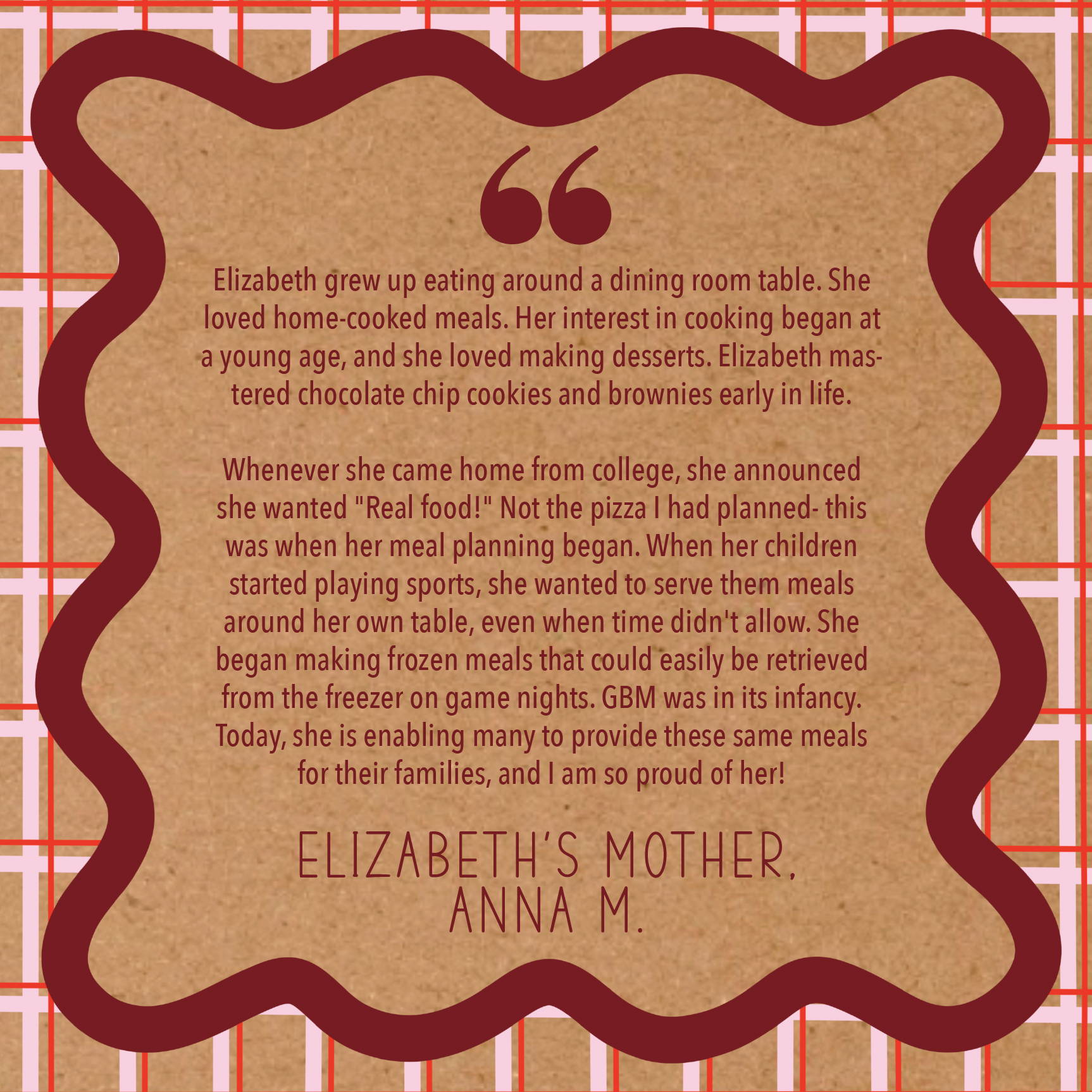 My mom, Elizabeth Rosenbalm, has been providing food for her community through Good Batch Mama for almost a decade, but her love for feeding people goes back to her roots. After being raised in an open home full of friends and Italian meals, she grew up to do the same and more. She delights in the sounds of voices in the living room and balls bouncing in the driveway, and earned the well-deserved name "Rosenmom" from Adam's high school peers. Although I've always called her mom, in 2014 when I got my first iPhone, I punched her name in as Wonderful Mother- and I haven't changed it since. Today is Elizabeth's birthday, and I wanted to show you how much she means to me and the people in her community by collecting a few "reviews" for her!