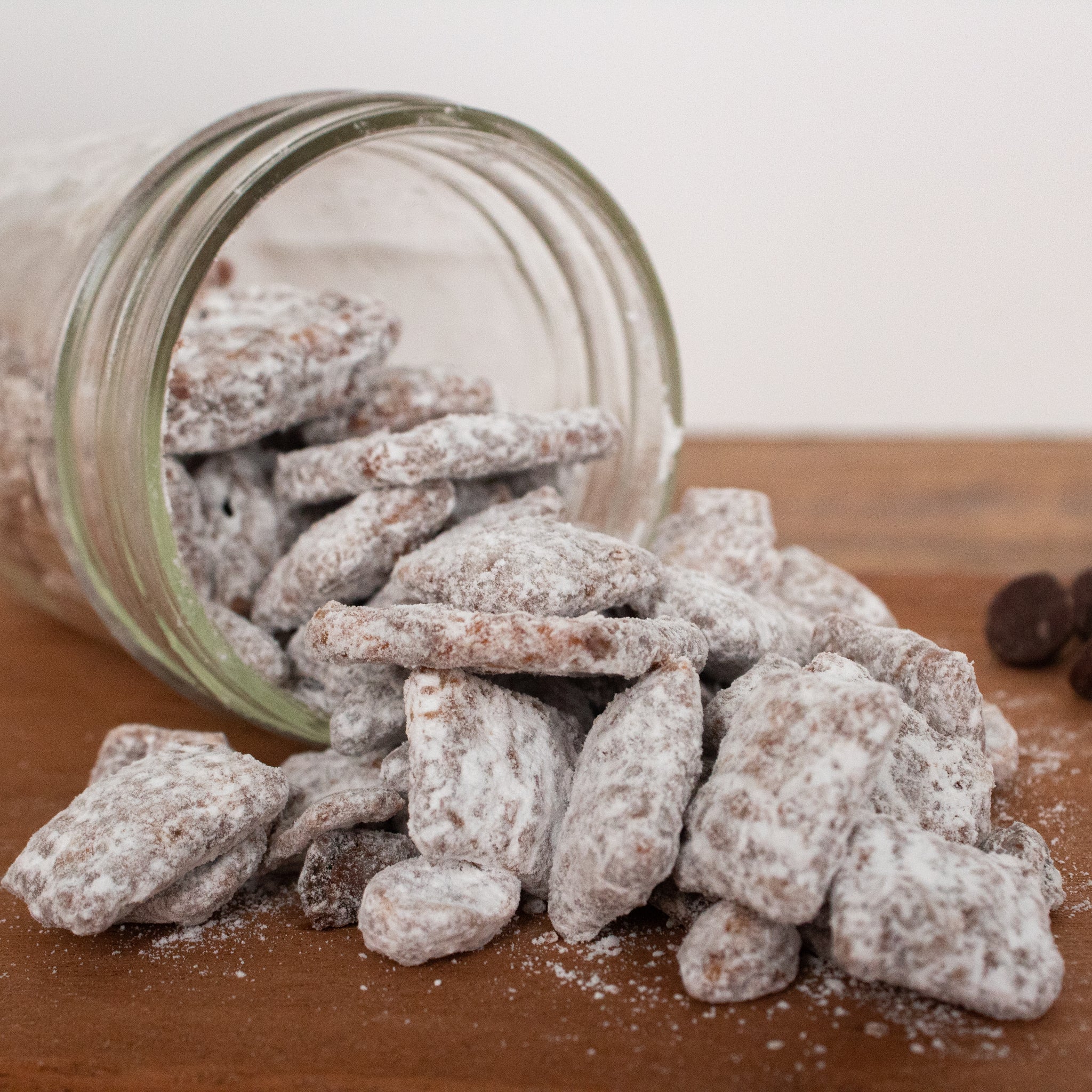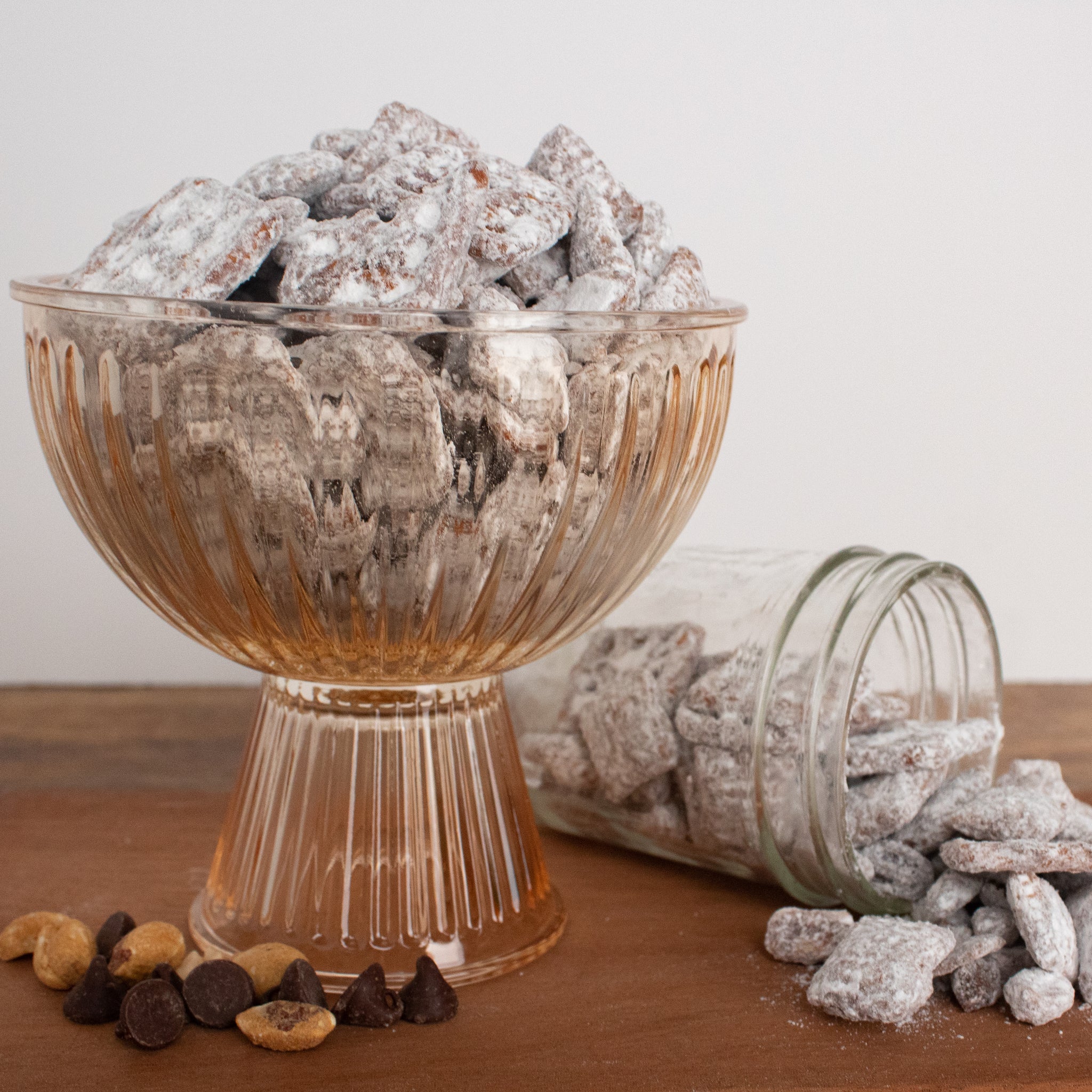 Peanuts, pretzels, raisins, and chex squares are mixed together with chocolate and powdered sugar to create your classic puppy chow or "trash" recipe. Settle down on the couch and munch on this irresistible dessert treat!