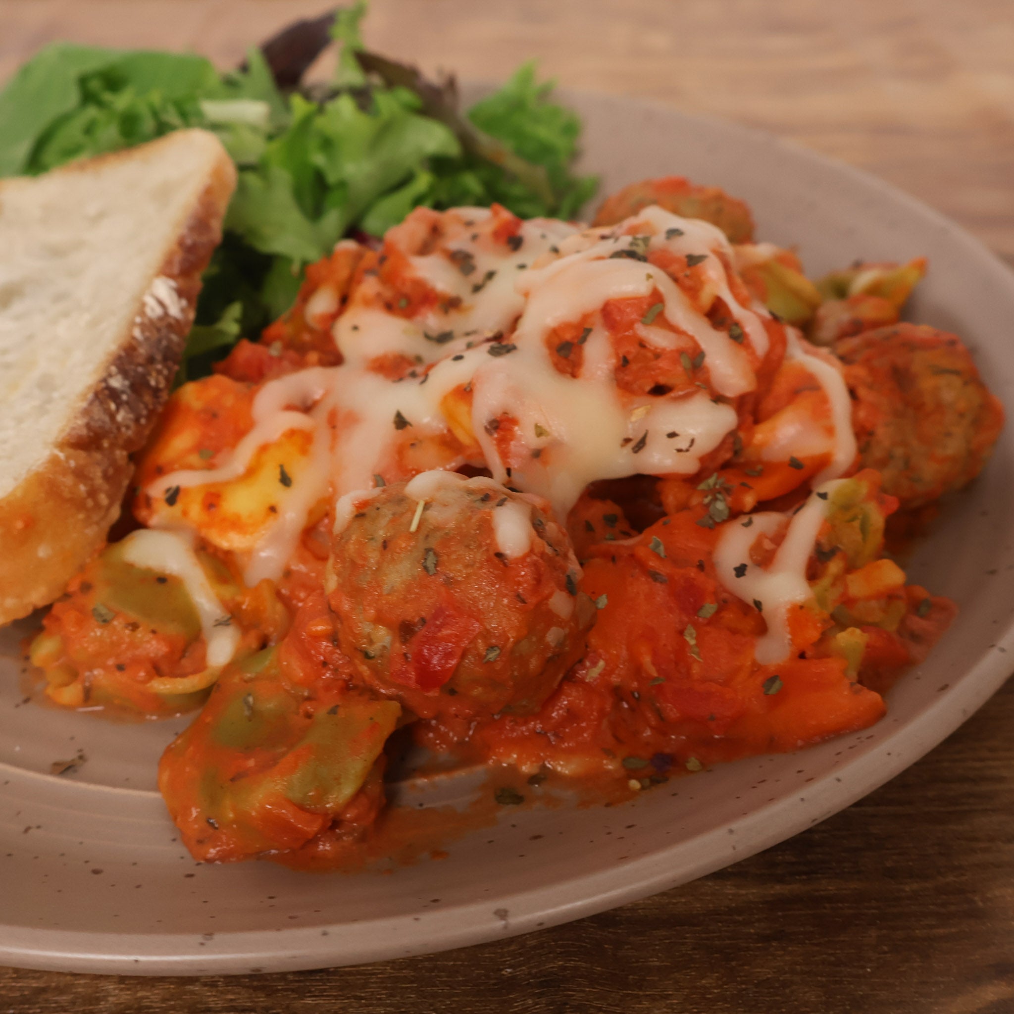 Tomato Basil Tortellini is a simple dish that is sure to please everyone at the table. Tri-color tortellini is mixed with meatballs and coated in a creamy tomato basil sauce. Finally, the pasta is topped with rich mozzarella cheese, completing this hearty one-dish meal. Enjoy this easy pasta recipe for your weeknight dinners!Â