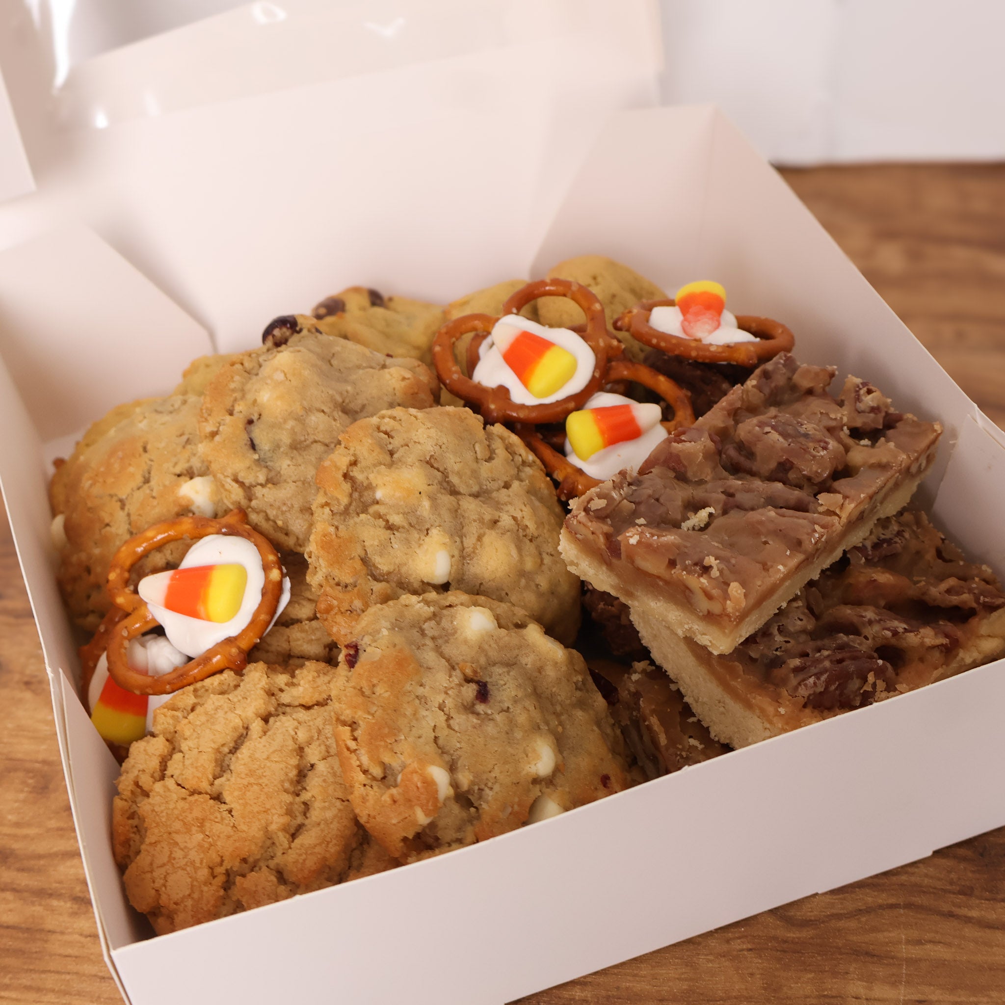 Feeling grateful? Treat yourself, your friends, and your family to this seasonal cookie box. Each box comes with 4 soft oatmeal white chocolate cranberry cookies, 3 shortbread pecan squares, 4 no bake cookies, 5 peanut butter cookies, 5 pumpkin chocolate chip cookies, and 6 white chocolate candy corn pretzels.