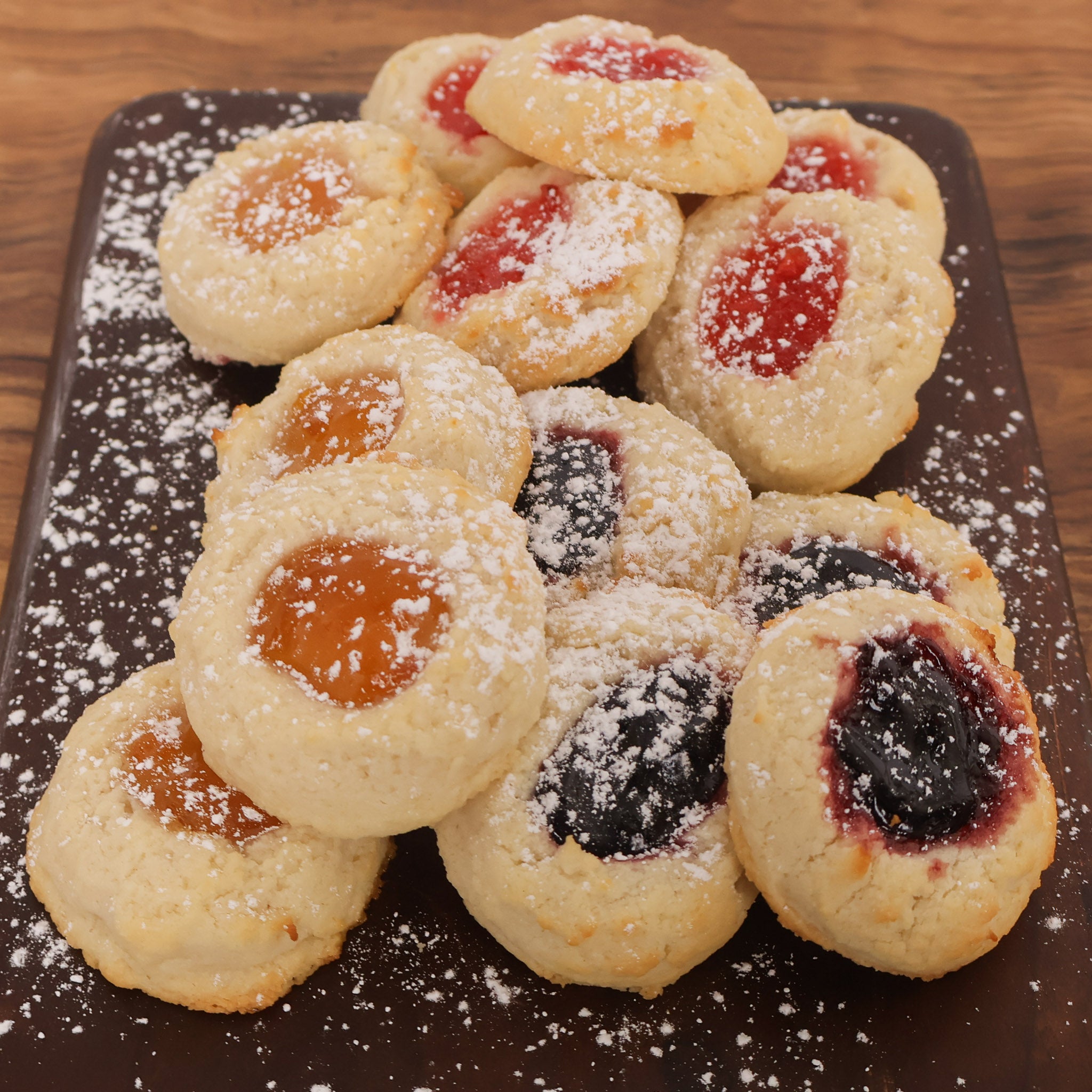 Thumbprint Cookies are buttery and tender treat with a jam filled center. This egg free cookie includes only a few ingredients and has hints of almond and vanilla in the dough. After being rolled into perfect circle, impressions are made in the dough and filled with sweet apricot, seedless blackberry, and homemade strawberry jams.Â
